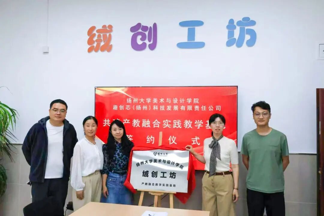 9月9日,扬州大学美术与设计学院联合趣创芯(扬州)科技发展有限责任公司,隆重举行了“扬州大学美术与设计学院绒创工坊产教融合教学实践基地”成立揭牌仪式。此次仪式的成功举办,标志着双方在产教融合、协同育人领域迈出了坚实且重要的一步,为学院针对毛绒玩具产业人才的培养注入了全新活力。