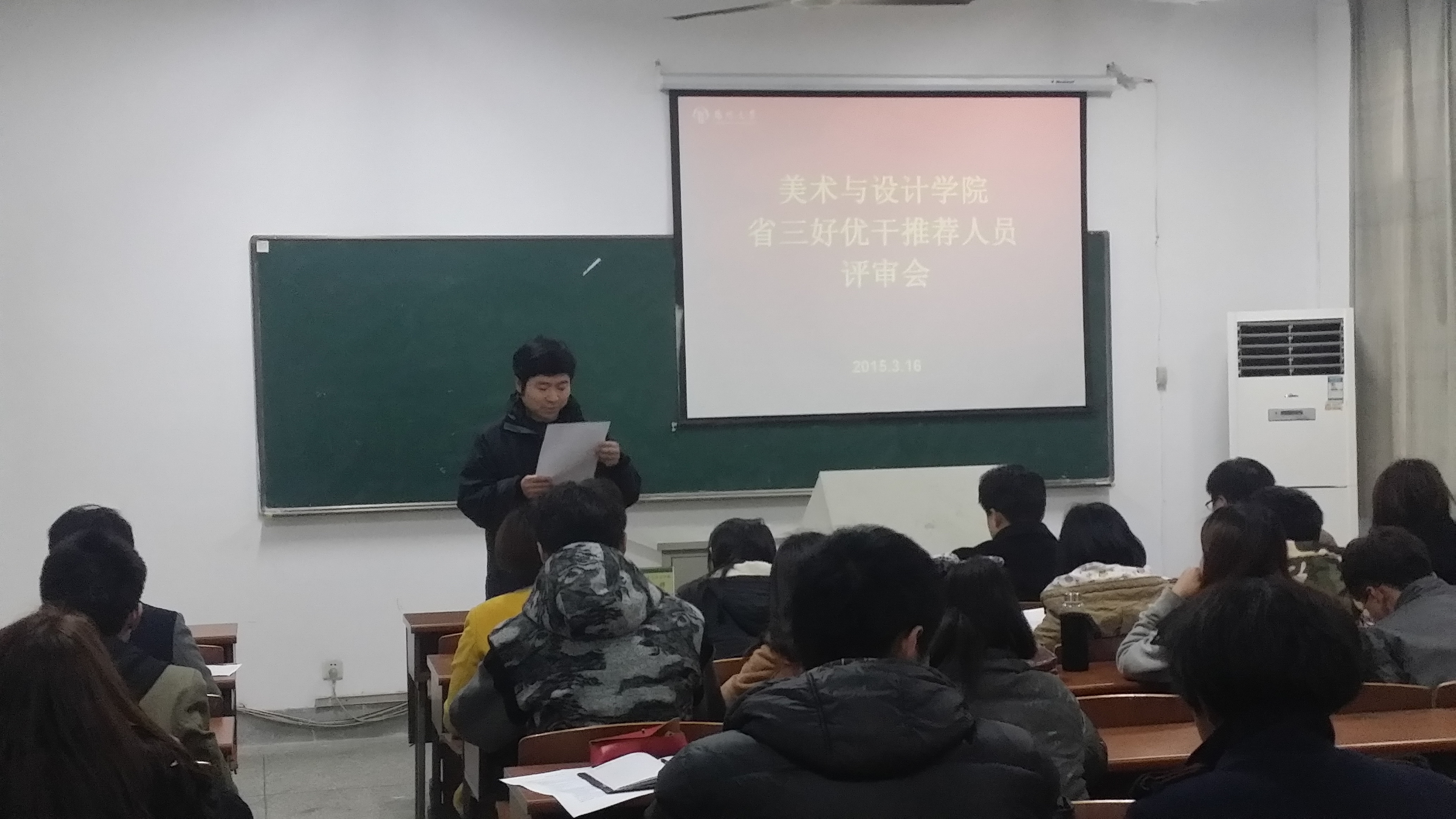 3月16日下午五点,扬州大学美术与设计学院组织召开了2014-2015学年度省级“三好优干”评审会,由院党委副书记陆江峰老师、院团委副书记鲁烨老师、院团委李响老师及各班级主要学生干部组成的评审小组参加了此次评优评审会。评审会由鲁烨老师主持。