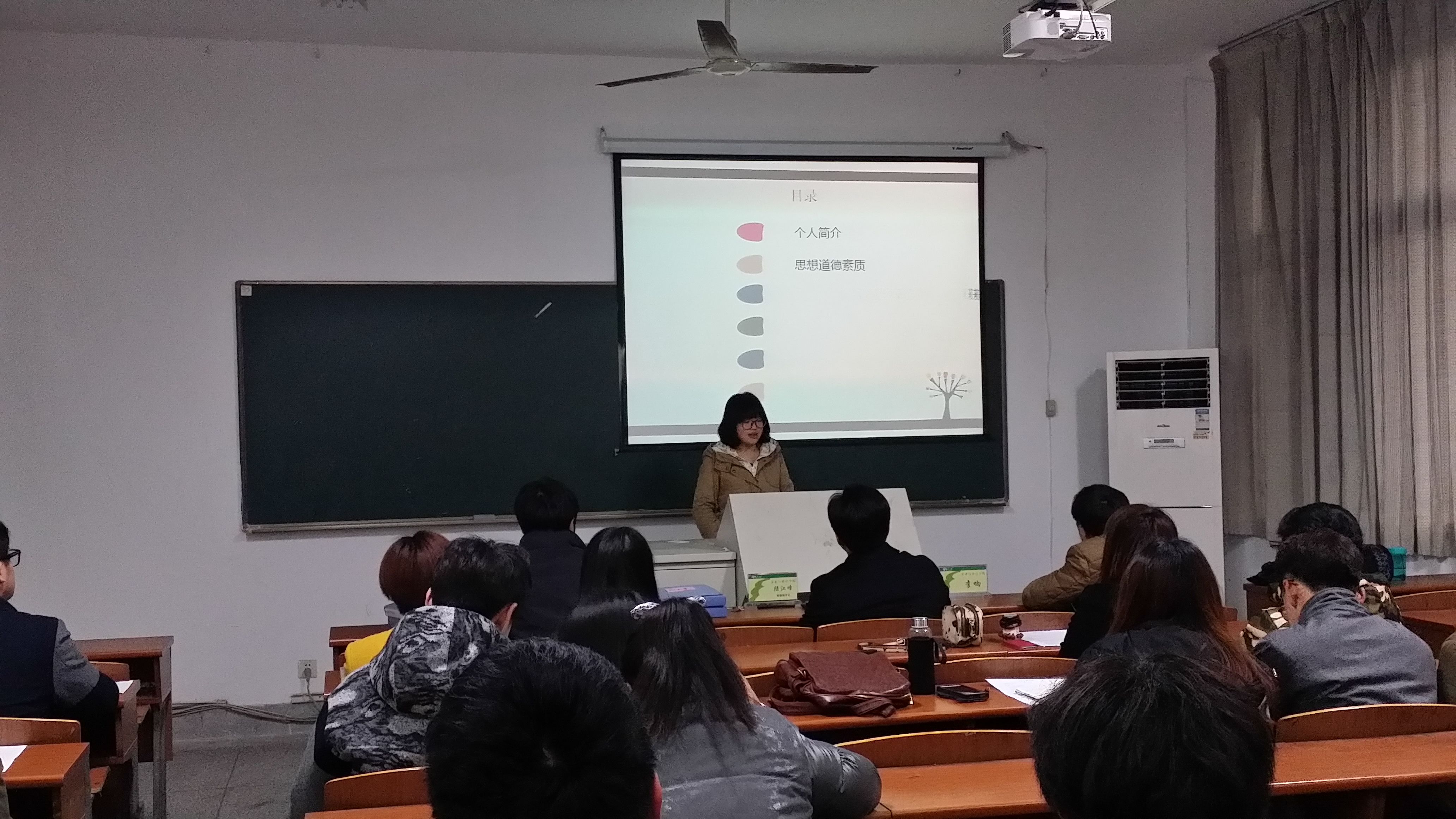 会上,鲁老师首先就评优评先工作的重要意义、评选条件、评审原则、评审具体要求作了说明和强调。省级“三好优秀学生干部”的述职环节随后进行。邓芳芳等4位候选学生依次上台以各自的形式进行了五分钟的述职报告,其中邓芳芳同学用自制的小短片这种新颖的表达方式极具冲击力地向大家介绍了本人的学习状况、思想建设情况、获奖情况、科技创新情况和社会工作情况等多方面,给在座的老师同学留下了深刻的印象;紧随其后的王博同学也声情并茂地讲述了他在学习生活中的经历与感受,同时也表达了对于学院给予本次述职机会的感谢。在每人报告结束后,三位老师及其他同学都对其演讲提出了问题,4位同学也给出自己的答案。