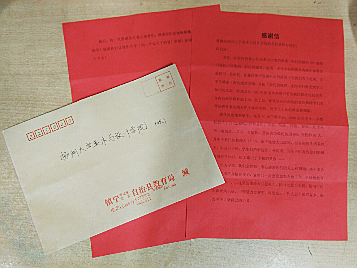 信中,老师再三对我院捐赠图书表示感谢,特别是38册美术类图书更为学校推进包括美育在内的素质教育加了油,鼓了劲。同时表示他们绝对不会辜负我们的期望,老师们一定会更努力的工作,更好的教育学生,学生们也会借此契机,用书中的知识充实头脑,用智慧改变贫穷,长大后为振兴家乡,振兴中华贡献自己的力量。