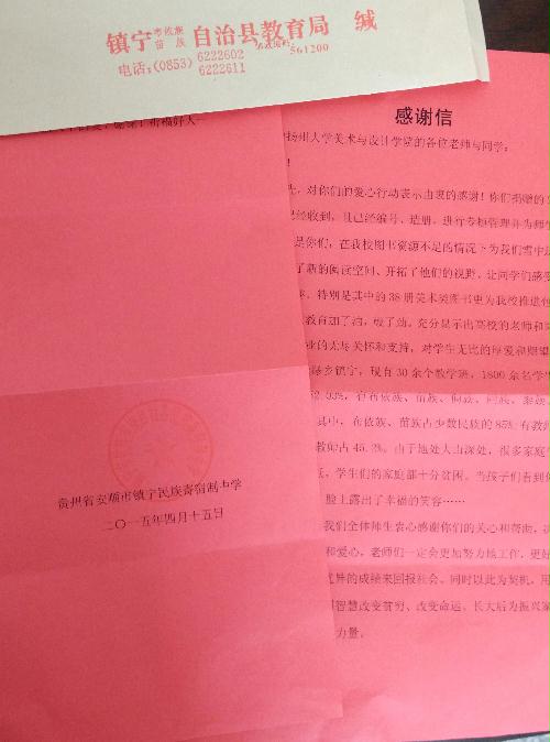 今天,我院团委收到了一封特殊的信件,这是从贵州省安顺市镇宁名族寄宿制中学寄出的,其中有一句感人肺腑的话:“当孩子们看到你们捐赠的图书时,脸上露出了幸福的笑容”。