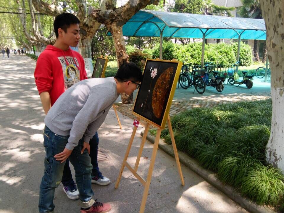 为推动学校艺术教育的纵深发展,丰富学生的课余文化生活,展现学生的绘画水平,促进艺术文化的交流性,继4月20日漆画作品展之后,我院于4月23日仍旧在扬州大学文汇路校区梧桐林荫道旁展示了众多学生辛苦制作的漆画作品。由于第一次展览取得了不错的反响,第二次展览得到了更大的关注度。