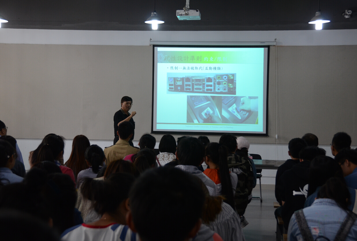 2015年4月24号下午14:00,台湾云林科技大学管幸生教授来我校美术与设计学院设计楼一楼展厅开展题为“感性设计触动新商机”的主题讲座,讲座由美术与设计学院副院长李玫老师主持,展厅座无虚席,美设学院服装设计1401、环设1301、1302的学生齐聚于此,认真聆听了管教授的精彩报告。