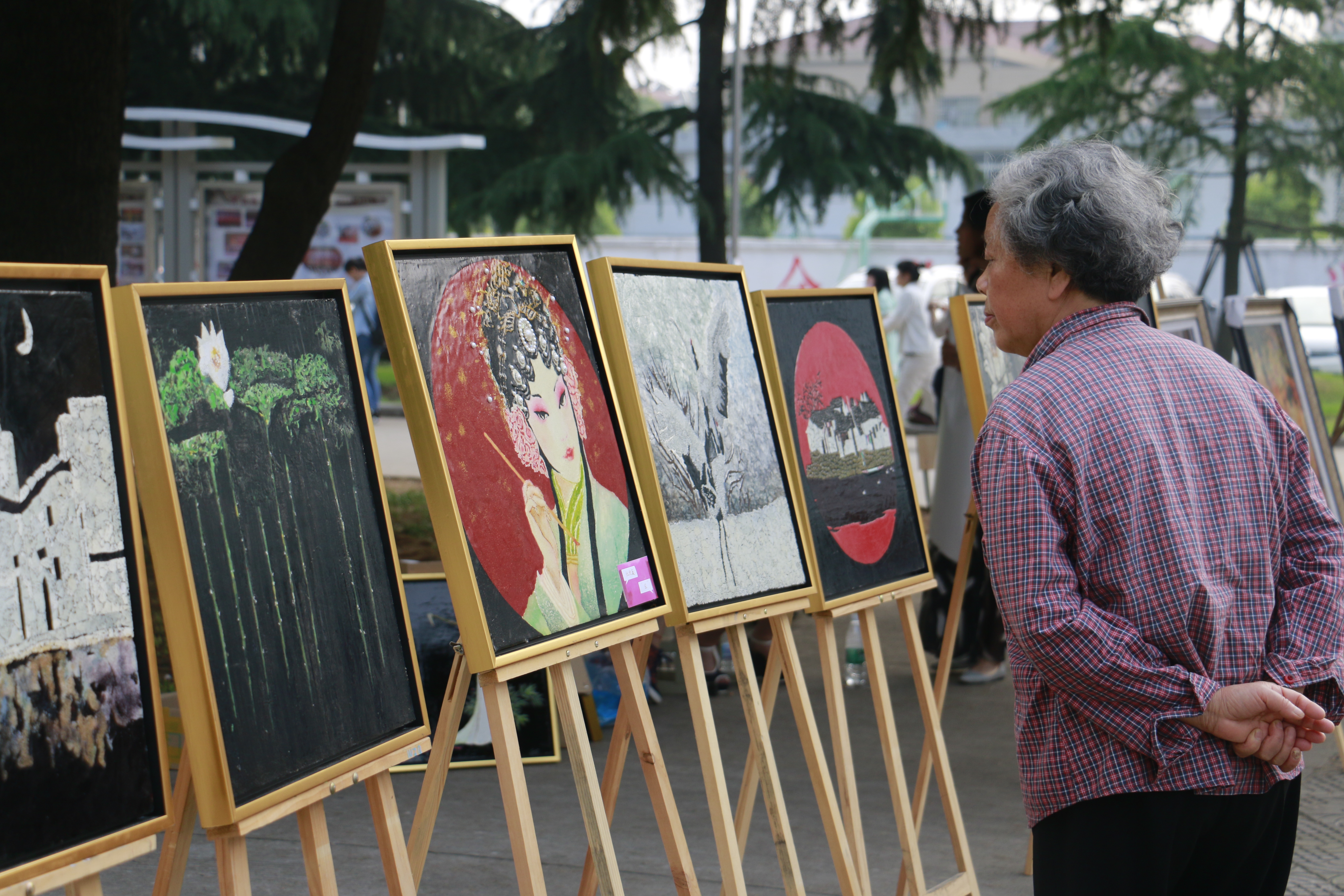 下午2点,我院工作人员首先在路边进行了漆画展览,共摆放了将近40幅优秀的漆画作品供来往的的师生们欣赏。一幅幅漆画作品依次排列在道路两旁,顿时让校园充满了艺术的气息。尤其是下课时,众多师生驻足在作品前,他们大都啧啧称奇,一边品味一边感慨这种美的创作,整个道路显得异常的热闹与欢快。面对参观者的疑问,漆协成员们也十分热情的向来往的人宣传展出的作品以及漆画知识。在画展过程中,漆协的两位优秀成员还通过现场制作的方式,向同学们展示了白磁盘与漆画制作的基本过程,受到了同学们的广泛关注。