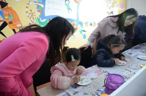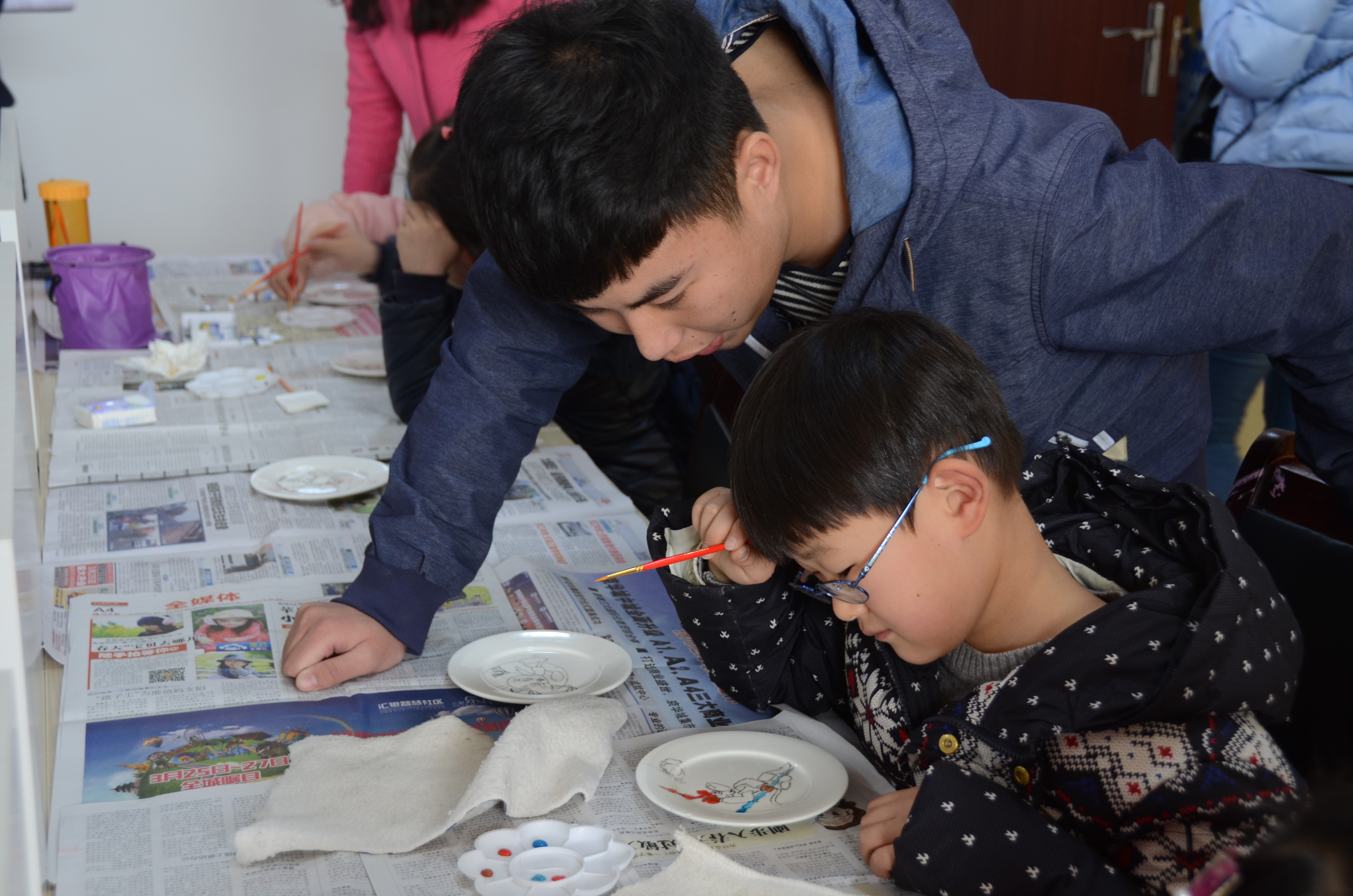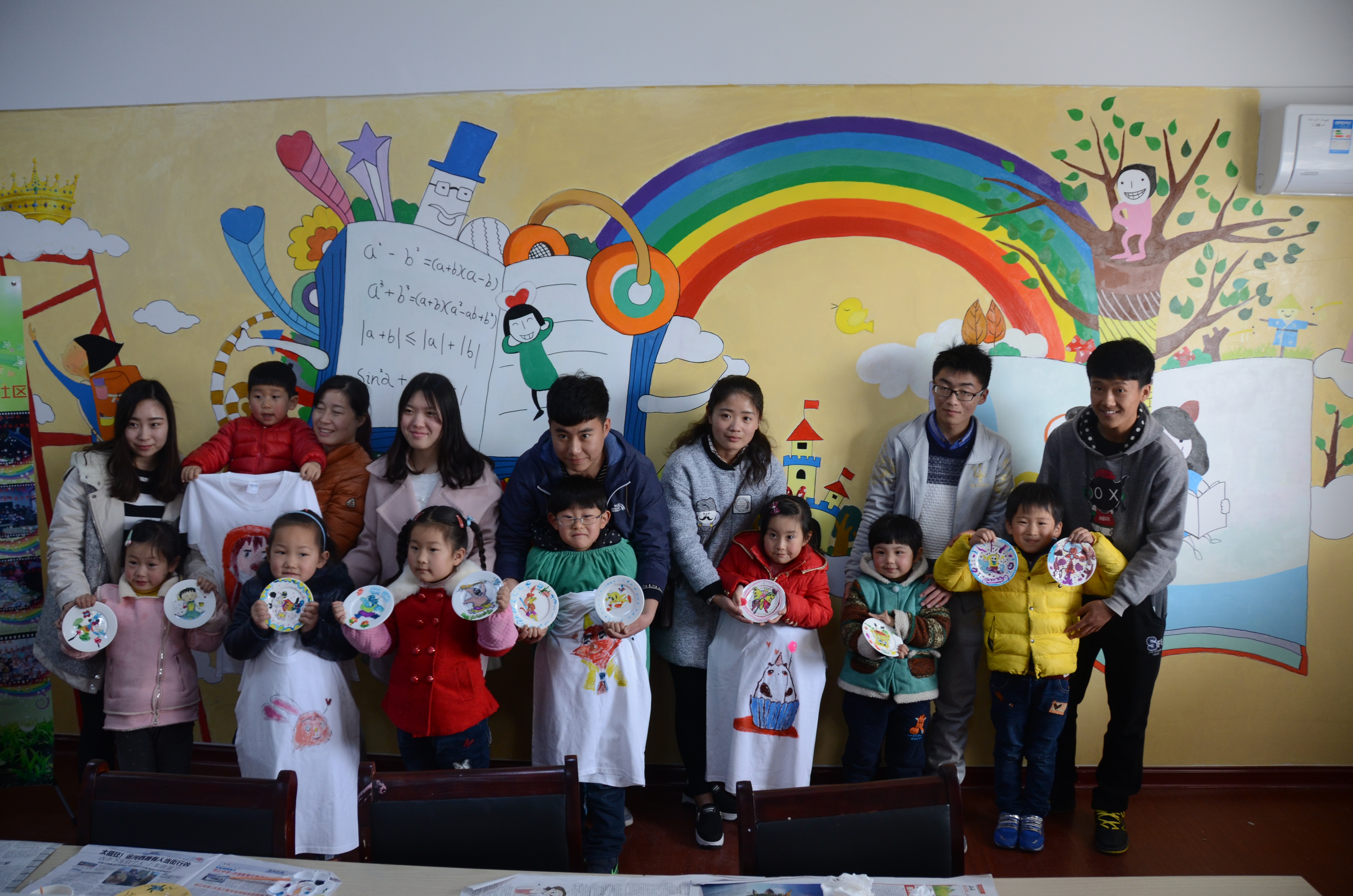 当天下午一点半,美院漆艺协会以及炫动堂部分成员在东门集合,在鲁烨老师的带领下前往西湖花园社区,抵达目的地后,同学们分成两组开始教孩子们画儿童画。小朋友们在事先绘制好外形的白瓷盘,T恤上进行填色,最终绘制成一副完整的儿童画。