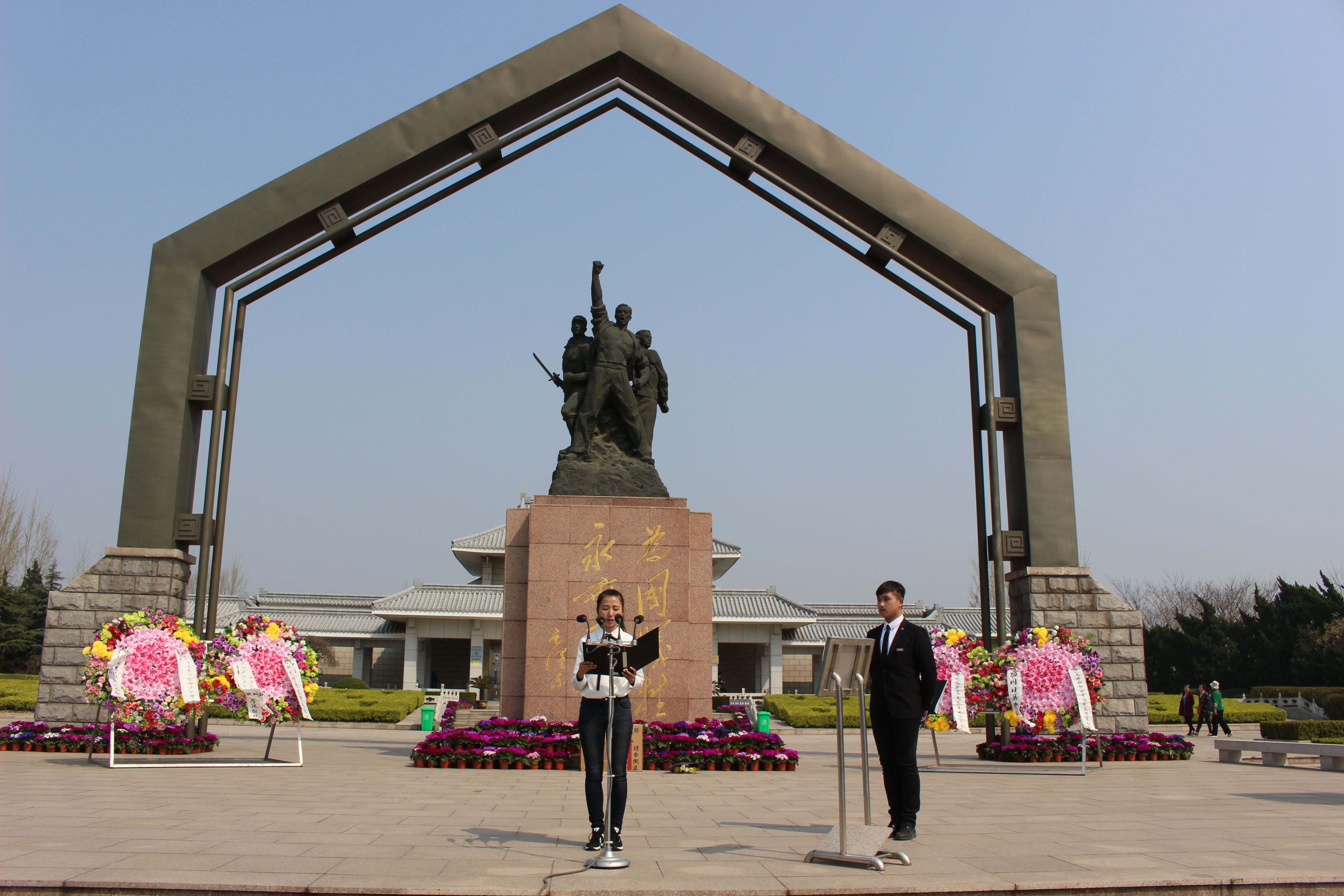 同学们在各个班委的组织下整齐有序的向烈士陵园前进,虽然路很长,但是同学们知道此次活动的严肃性,大家安全有序的过马路,迈着坚定的步伐向烈士陵园行进。抵达目的地后,扬州大学文汇路校区祭扫烈士活动正式开始。在主持人的主持下,同学们肃立默哀一分钟。随后由学生代表献上挽联。全场一片肃穆,学生代表缓缓烈士雕塑前,怀着最崇高的敬意,将手中轻盈而又沉重的挽联献上。最后由美术与设计学院的学生代表王珊发言,由她代表同学们向英雄先烈们表达哀思。