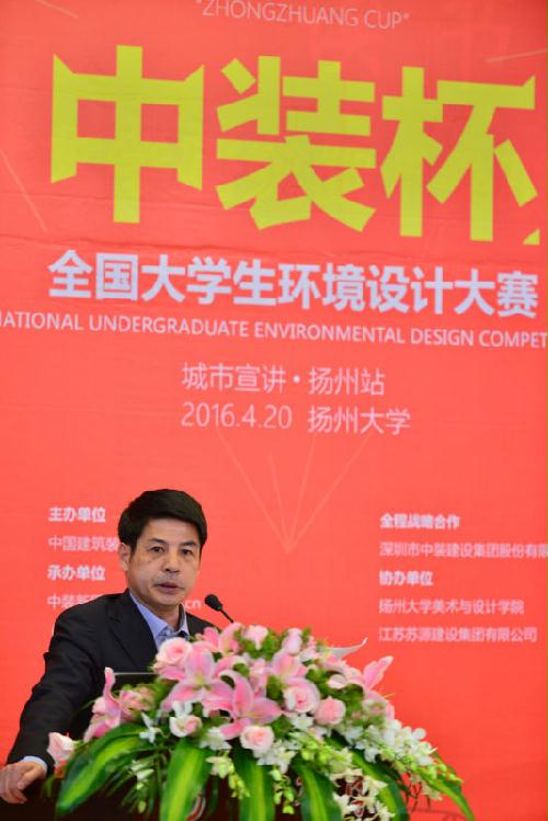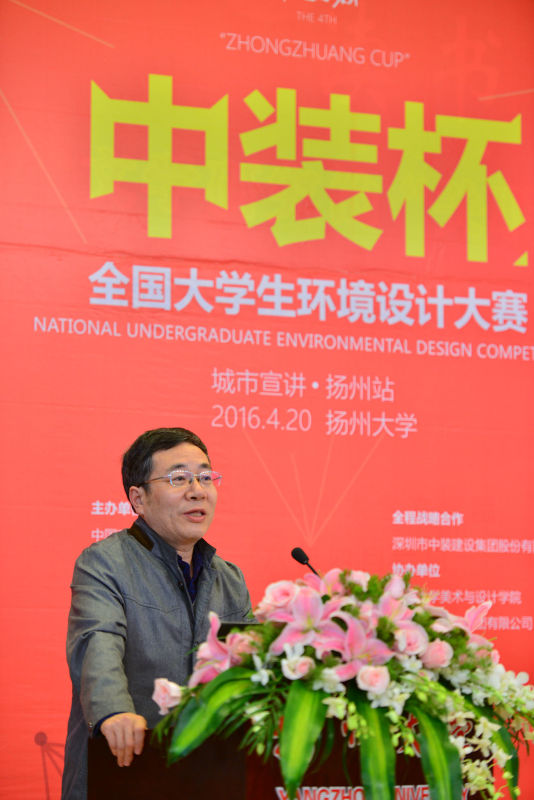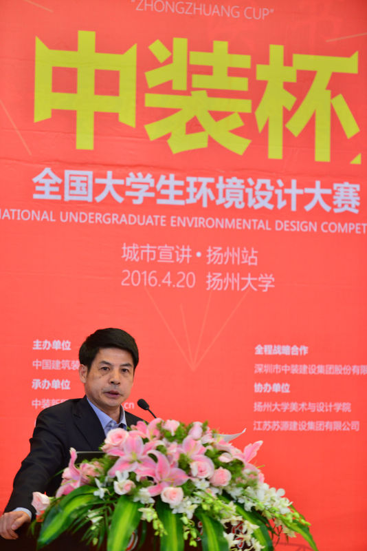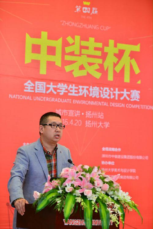4月20日下午三点在荷花池校区图书馆报告厅内,莅临本次宣讲活动的嘉宾有:扬州大学美术与设计学院院长贺万里老师,扬州大学美术与设计学院副院长李玫老师,中国建筑装饰协会副秘书长艾鹤鸣先生,北京银坐标装饰设计有限公司设计总监、北京服装学院老师孙凯先生,资深设计师、传统家具研究者、匠学图绘作者乔子龙先生,江苏苏源建设集团有限公司董事长居民祥先生,扬州瀚鼎建筑设计咨询有限公司设计总监咯余慧先生,中装新网的副总经理刘玄先生,中装建设南京设计院长王海先生。