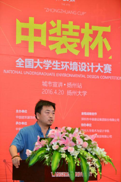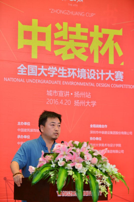 活动由中国建筑装饰协会副秘书长艾鹤鸣先生的精彩致辞拉开帷幕,他提到“我国装饰行业已步入转型和升级的关键时期,但是装饰水平不高、装饰设计人才的紧缺现状束缚了我国装饰行业发展。举办中装杯的目的在于挖掘、培养优秀设计人才,促进人才培育和产业需求的有效对接,实现人才成长和企业发展的双赢目标。”紧接着由扬州大学美术与设计学院院长贺万里老师进行了致辞,他明确指出我院办学理念与目标并表示对“中装杯”的支持,鼓励我院学子积极参赛。然后江苏苏源建设集团有限公司董事长居民祥先生、扬州瀚鼎建筑设计有限公司设计总监葛余慧先生分别进行了讲话。活动中温文尔雅的孙恺老师进行了有关设计可能性、设计的切入点的讲座,给大家娓娓道来了一些设计生活中的经验及建议。导师乔子龙就新中式家具、现代中式家具进行了介绍,同学们都受益匪浅。