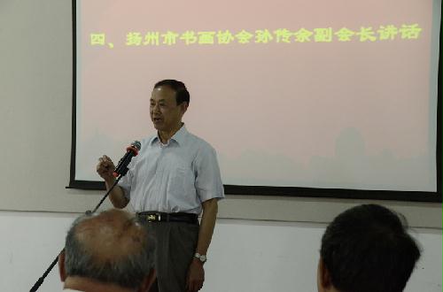 扬州市书画协会副会长孙传余对此次活动作出高度评价,他代表扬州市书画协会对共建活动取得的成果表示祝贺。他表示扬大关工委的共建活动从形式上和内容上都值得借鉴,同时他介绍了扬州市书画协会进校园活动的经验和做法,他希望扬州市书画协会、扬大关工委及美术学院要经常交流共建经验,共同促进双方的进步。他最后预祝活动圆满成功!