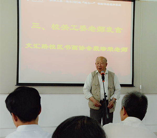 文汇路校区老年书画组组长殷珍荣老师对如何做好学院与关工委共建工作提出了三点希望。第一,希望师生携手共进,以书画促交融,提升共建新水平;第二,希望师生书画经验代代传,老少彼此用心交流感悟,展现共建新气象;第三,师生之间互相尊重,互相共勉,互相鼓励,互相关爱,促进共建新常态;他相信在老年书画组和同学们的共同努力下,共建工作会越发成熟向上。