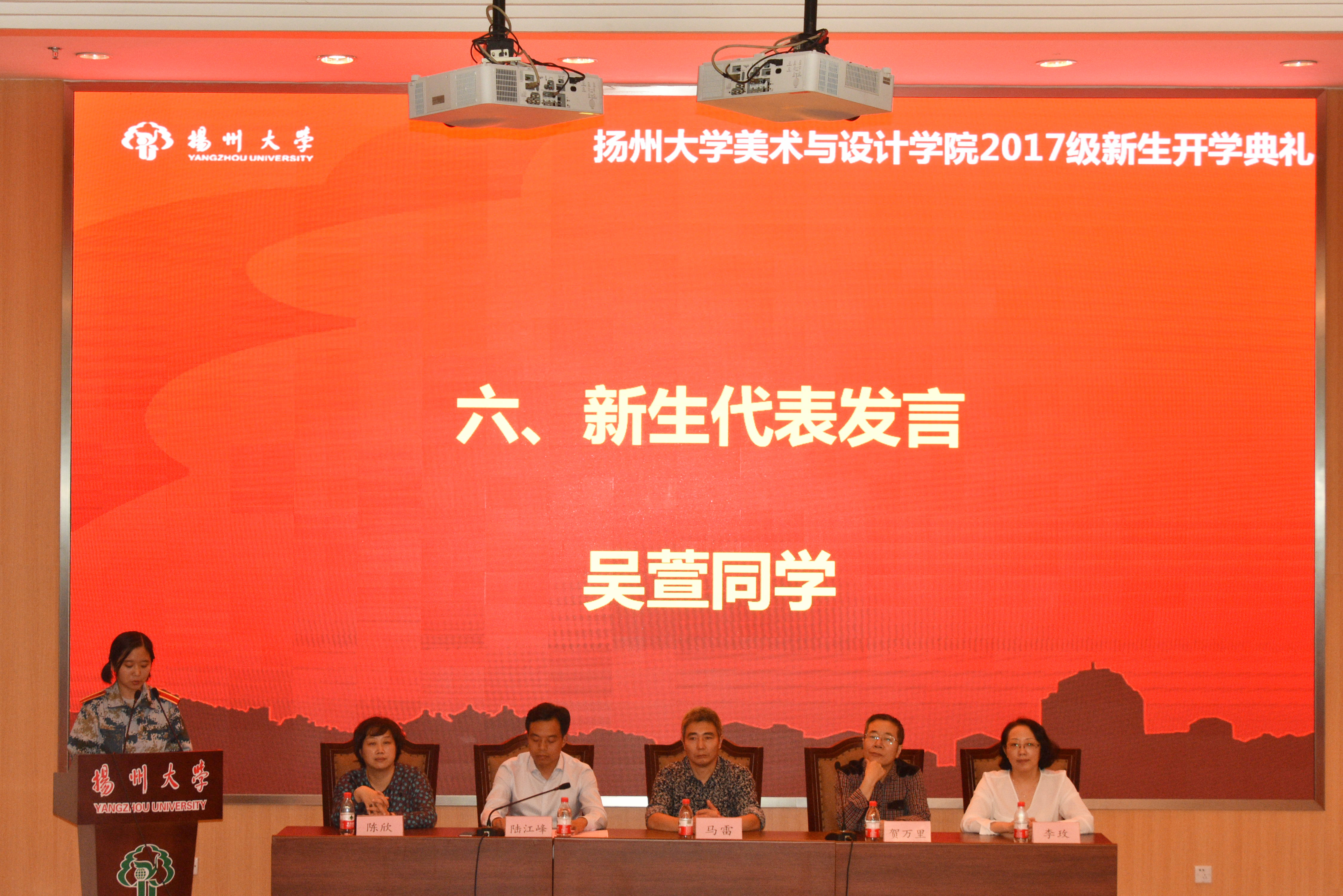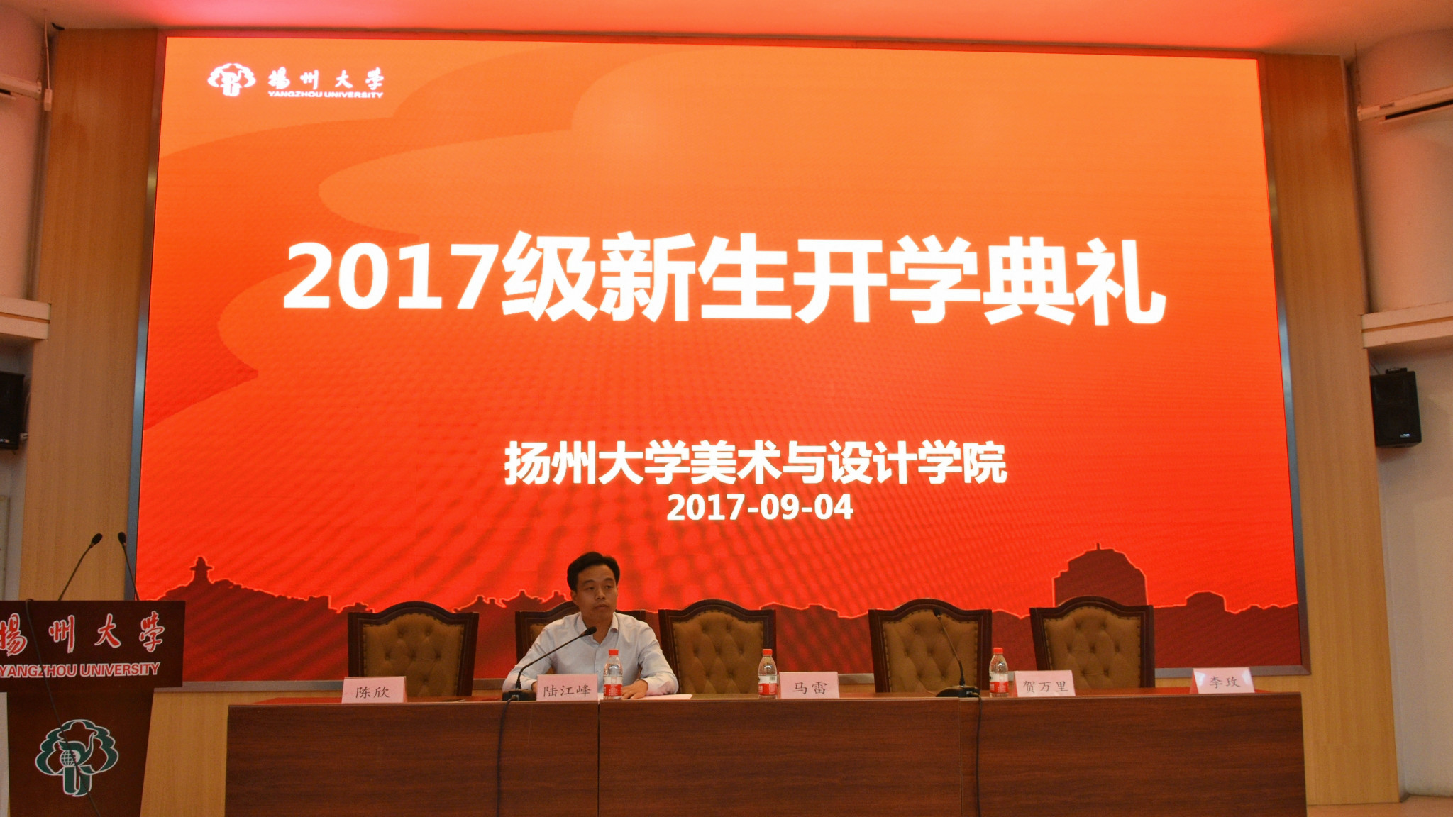 2017年9月4日下午,我院于荷花池校区逸夫报告厅内,举行了2017级新生开学典礼。院党委书记马雷、院长贺万里、党委副书记陆江峰、副院长李玫、副院长陈欣、美术学学科主任吴越滨,环境设计学科主任王冬梅,服装设计专业主任严加平,院办公室主任谢兴兵、院综合办公室负责人、院团委学工办负责人、教师代表、全体2017级本科生和研究生班主任以及全体2017级新生出席了本次典礼。会议由院党委副书记陆江峰主持。