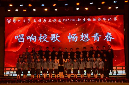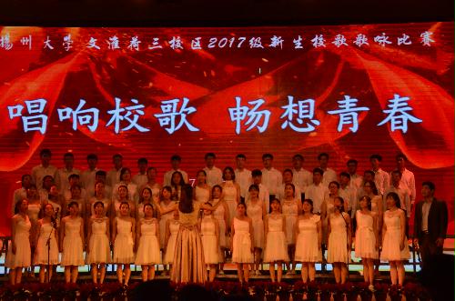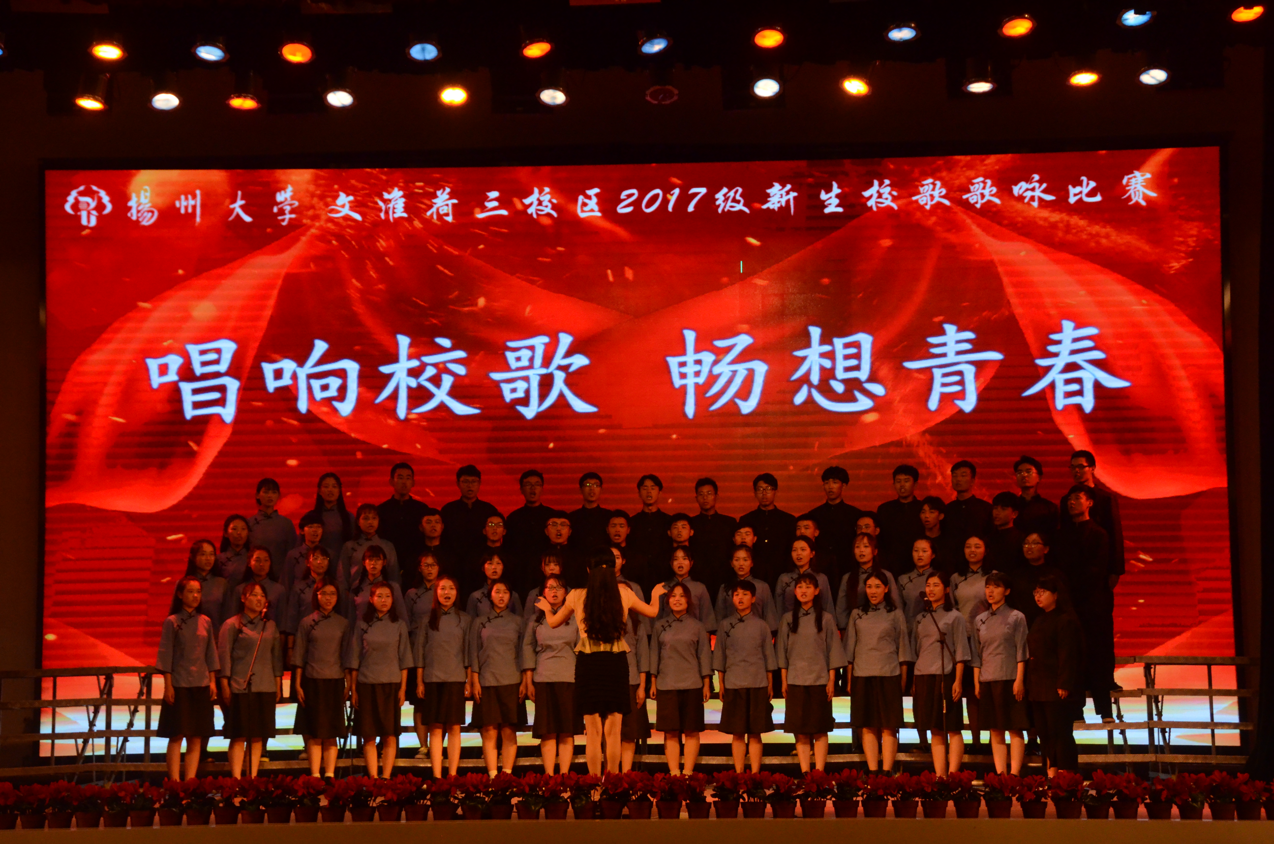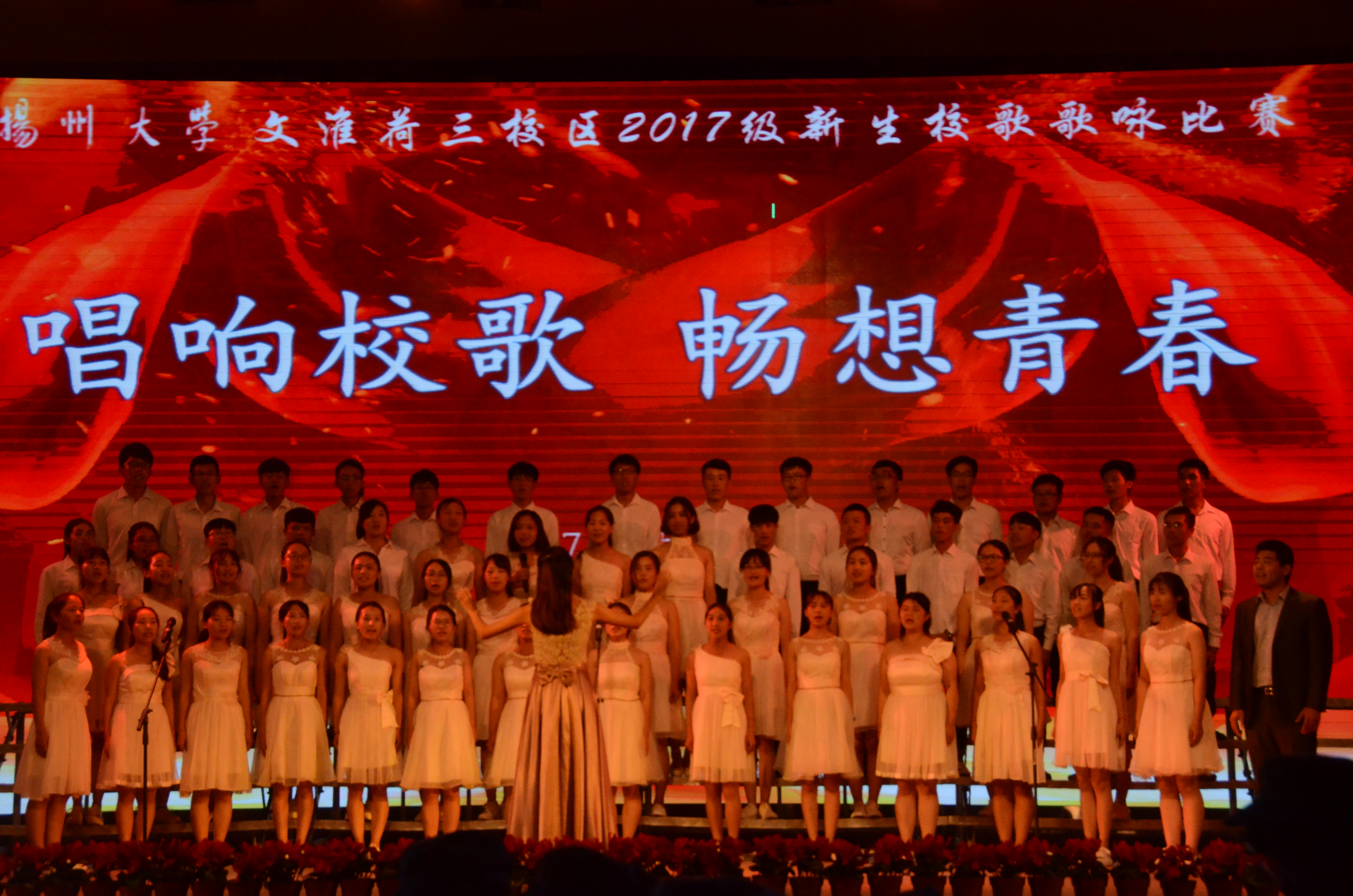 夏蝉冬雪从别后,又是一年迎新时。新生们对扬大有了初步的了解,感知了扬大校园的美丽风景后,2017年9月12日晚,主题为“唱响校歌,畅想青春”的文淮河校区新生校歌歌咏比赛在文汇路大礼堂举办。新生们通过一场精彩的校歌比赛来回应对于扬大的憧憬和热爱。参与此次歌咏大赛的共有来自文淮荷三校区的十一个学院,其中我院环设1703,公艺1701班代表我院参赛。