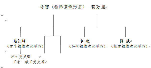 学院党委书记、院长是学院意识形态工作第一责任人,带头抓意识形态工作,带头管阵地、把导向、强队伍,带头批评错误观点和错误倾向,切实把校党委承担的有关意识形态工作主体责任层层落到实处。各分管工作班子成员按照“一岗双责”的要求承担分管领域的主要领导责任。班子主要负责人应带头抓意识形态工作,重要工作亲自部署,重要问题亲自过问,重大事件亲自处置。各分管工作班子成员协助抓好统筹指导工作,参与决策,抓好各分管领域的网络意识形态工作。具体分工如下图:
