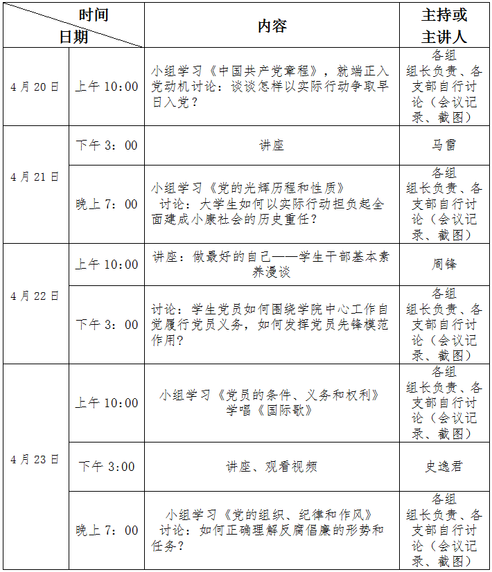 4月20日 | 上午10:00 | 小组学习《中国共产党章程》,就端正入党动机讨论:谈谈怎样以实际行动争取早日入党? | 各组 组长负责、各支部自行讨论(会议记录、截图) |