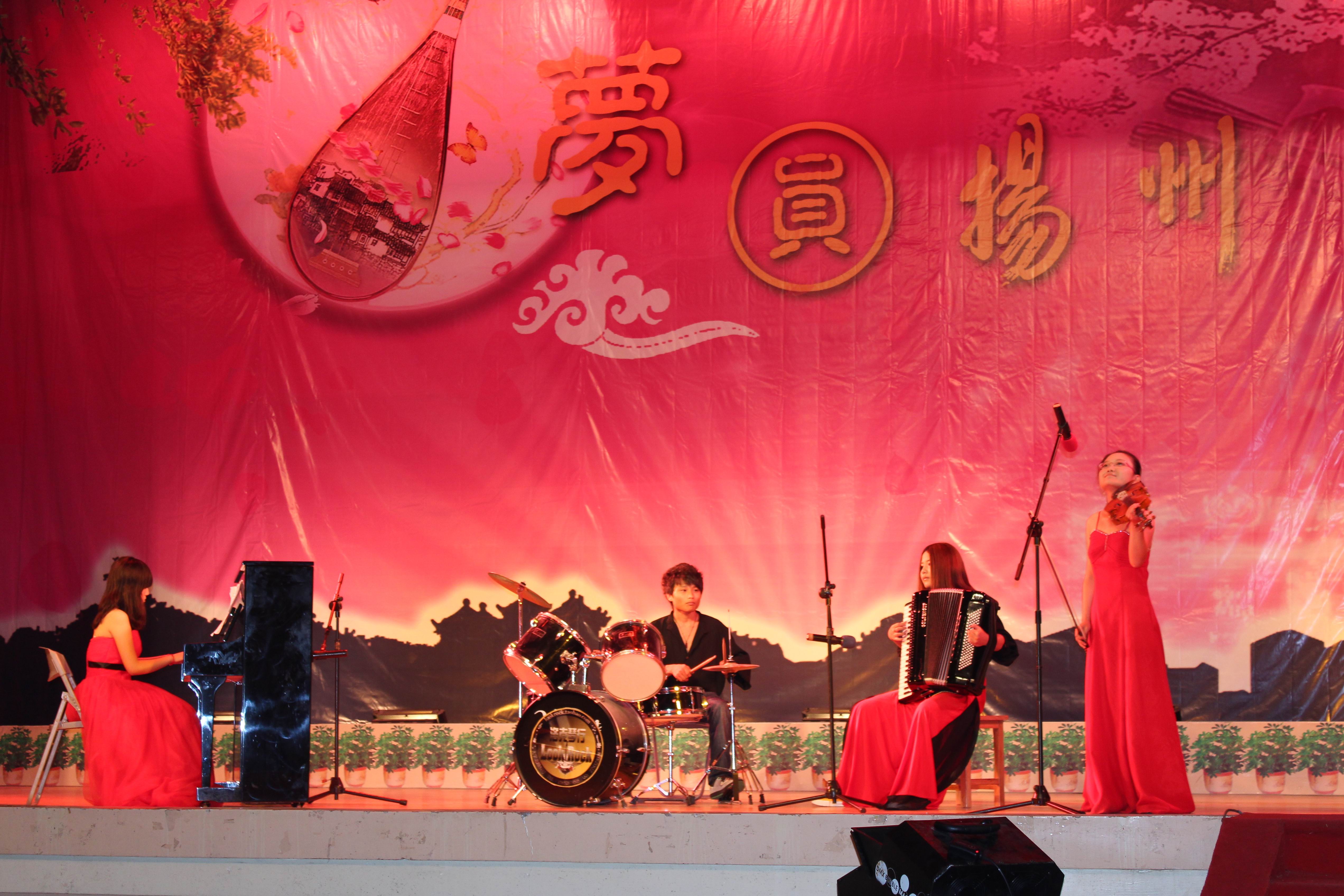 随后由08级学长和11级新生共同演绎的器乐小合奏《自由探戈》闪亮登场,博得了全场阵阵掌声与喝彩。接下来学姐们的民歌联唱带领全场师生领略了多彩的扬州风情。而我院副院长邵萍老师演唱的一曲声情并茂、扣人心弦的《望月》,更是将现场气氛推向高潮,唱出了在场新生在这中秋佳节对于家乡亲人的深切思念,博得了观众欢呼与掌声。