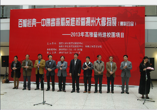 5月17日上午10时 “百幅经典—中国书画精品进校园展(复制珍品)”于扬州大学逸夫图书馆展厅隆重开幕。南京大学文化艺术教育中心主任康尔教授、南京大学文化艺术教育中心副主任黄正明教授应邀出席。此次作品展完美再现了中国历代书法名画,收罗宏富。展品年代远涉东晋书圣王羲之,近至唐、宋、元、明、清,近现代及齐白石、张大千,各家各派,百花齐放。