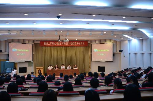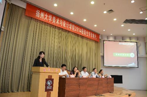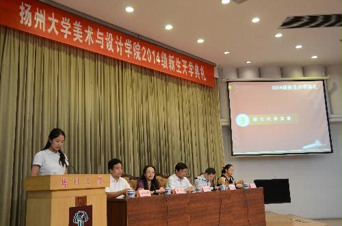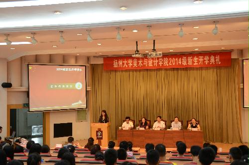 2014年9月11日,扬州大学美术与设计学院2014级新生开学典礼在逸夫报告厅隆重举行。院党委书记周建兵、院长贺万里、副院长李玫、副院长陈欣共同出席此次开学典礼,出席此次开学典礼的还有专业主任、院办公室教师、新生班主任、教师代表、老生学生代表、2014级全体新生。典礼由院党委副书记陆江峰主持。