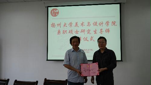 在本次仪式上,扬州大学美术与设计学院贺万里院长和湖州师院艺术学院汪洋院长分别致辞,湖州师院研究生处李庆峰处长、我校研究生院吉丹如副院长分别代表所在职能部门对两院合作予以祝贺,并表示将积极支持两院开展活动,预祝两院合作结出丰硕成果。学院双方签署了合作意向书,贺万里院长代表学院向四位教授颁发了校外兼职硕士生导师聘书。