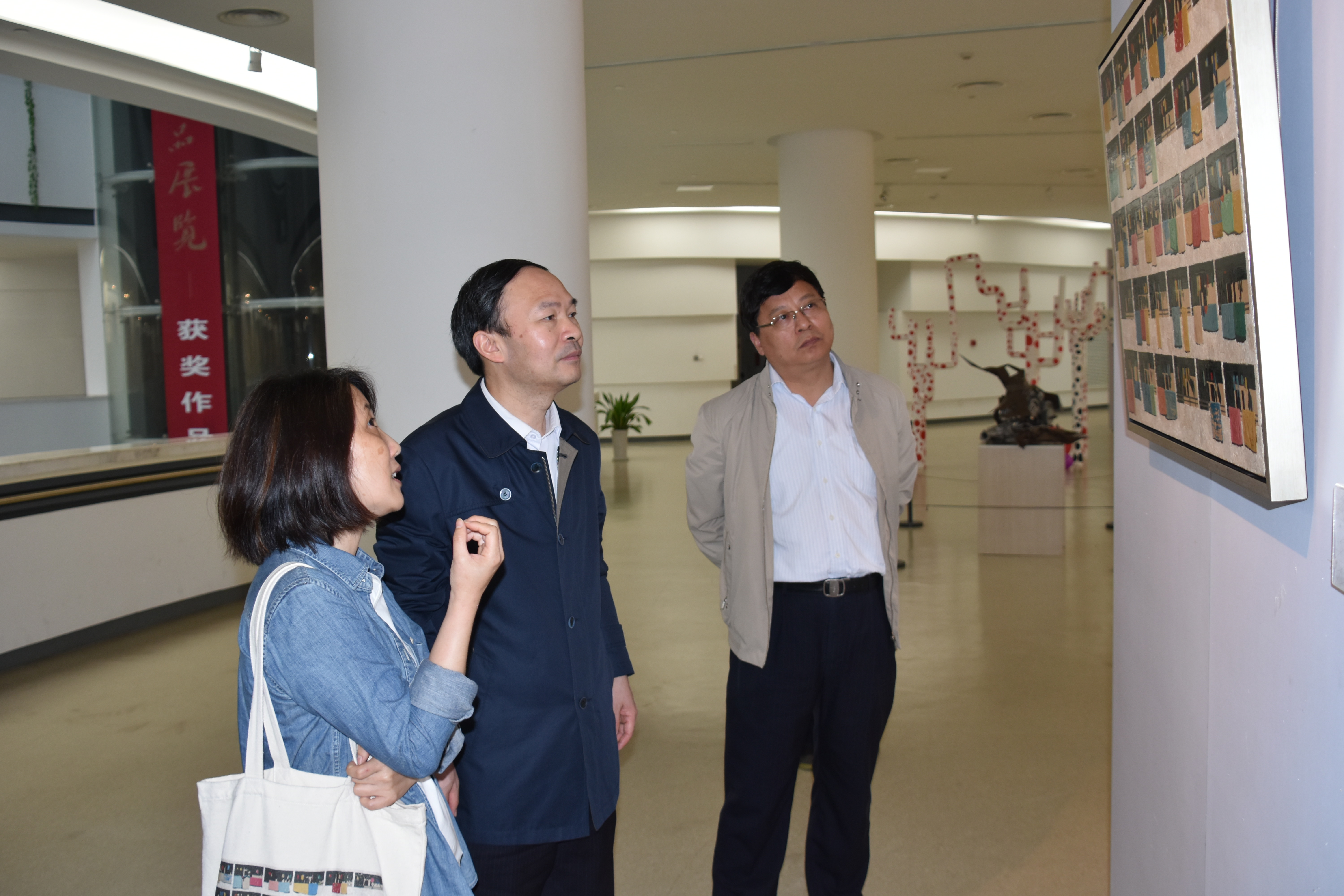 6月8日,校长焦新安来到扬州市美术馆观看2016届美术与设计学院毕业作品展。