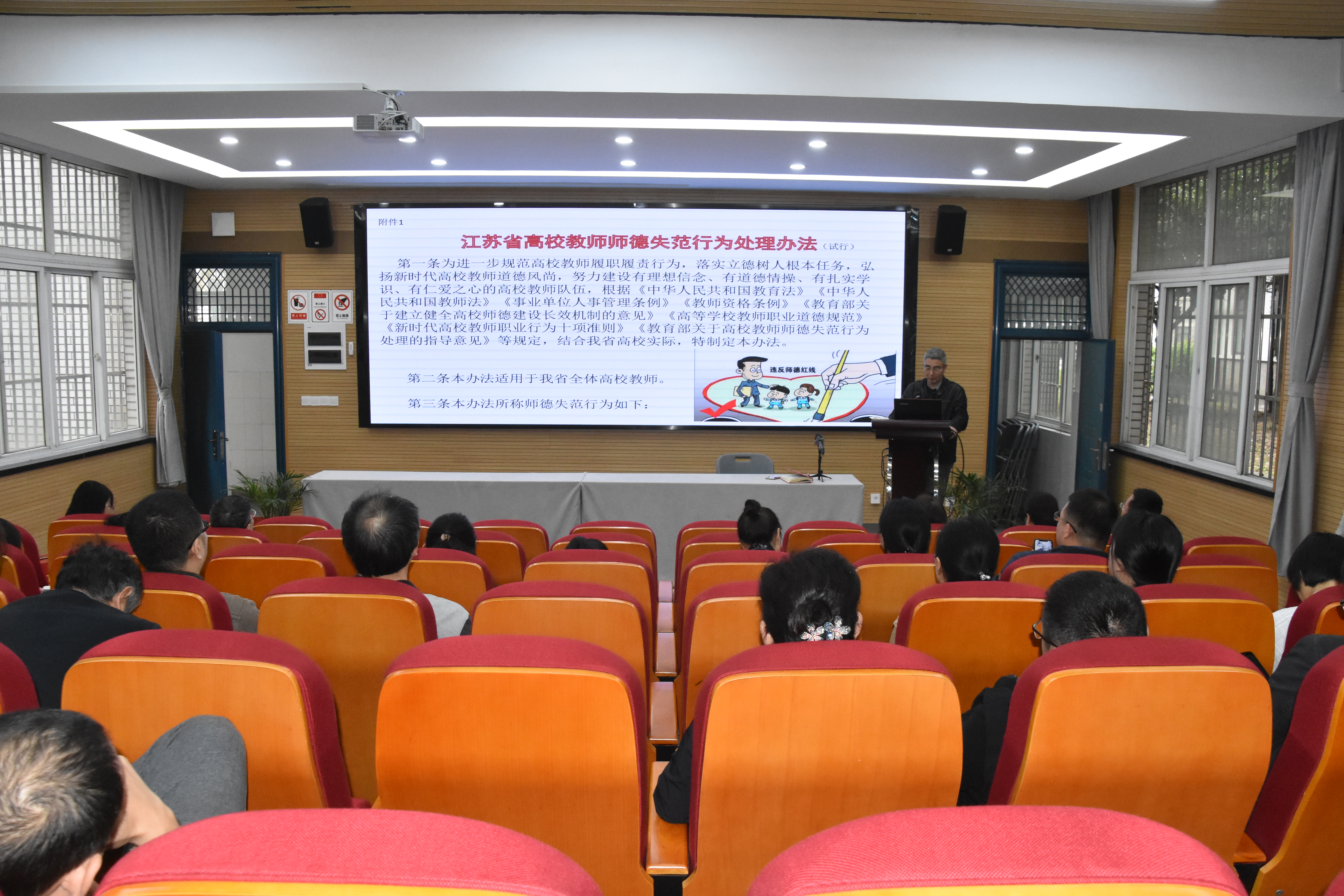 10月9日下午,我院在学院报告厅组织全体教职工学习了《江苏高校教师师德失范行为处理办法(试行)》。本次学习会由院党委书记马雷主持。