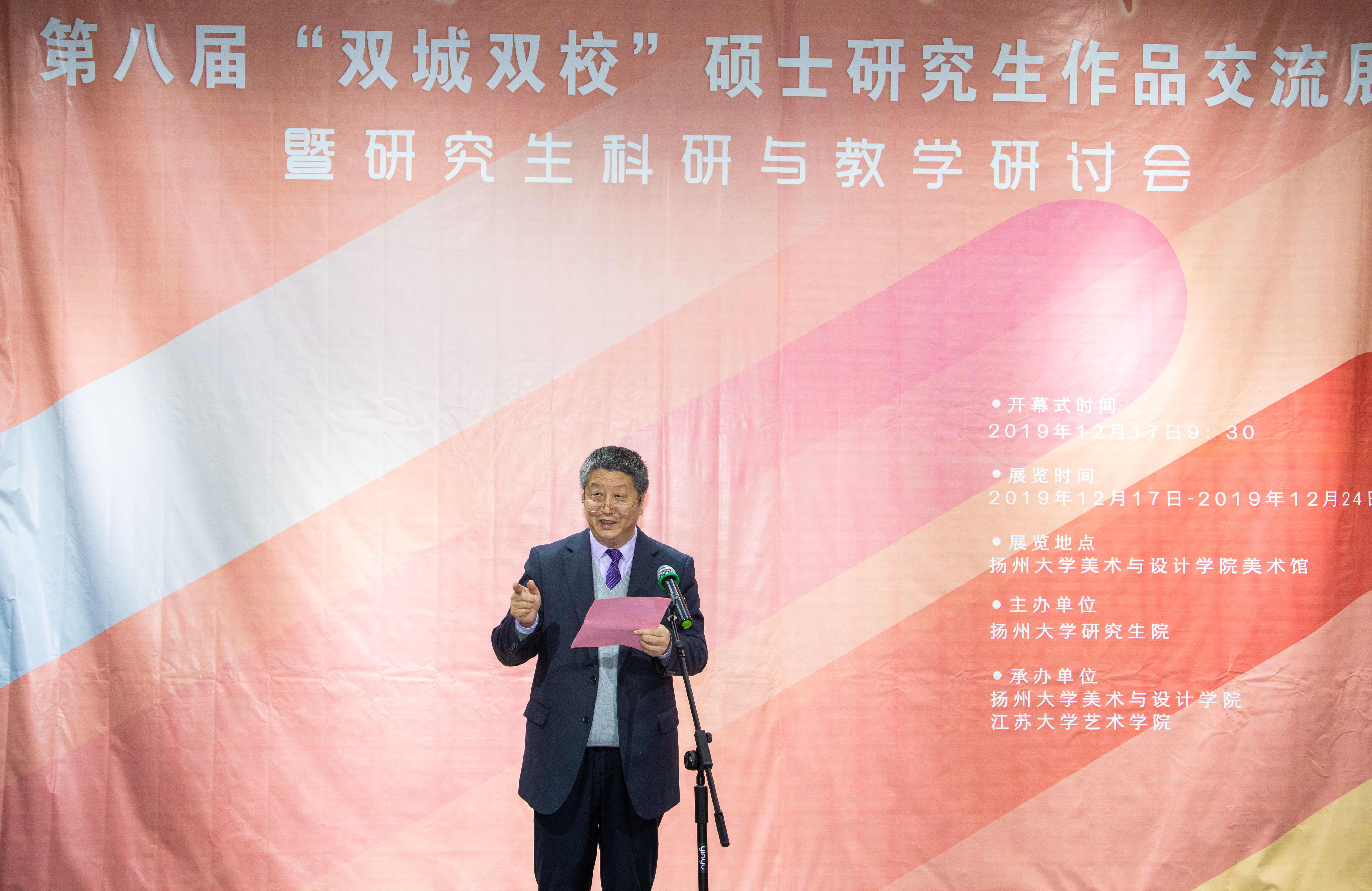 12月17日上午,由我院与江苏大学艺术学院主办的“筑梦青春,勇担使命”——第八届“双城双校”硕士研究生作品交流展开幕式在我校美术馆隆重开幕。扬州大学副校长陈国宏、研工部部长吴刚、江苏大学艺术学院党委书记朱立新、副书记王飞、副院长张文莉、江苏大学研工部副部长万由令、外聘教授安东尼奥·皮埃特罗·拉蒂尼、我院全体院领导以及两校部分师生代表出席活动。