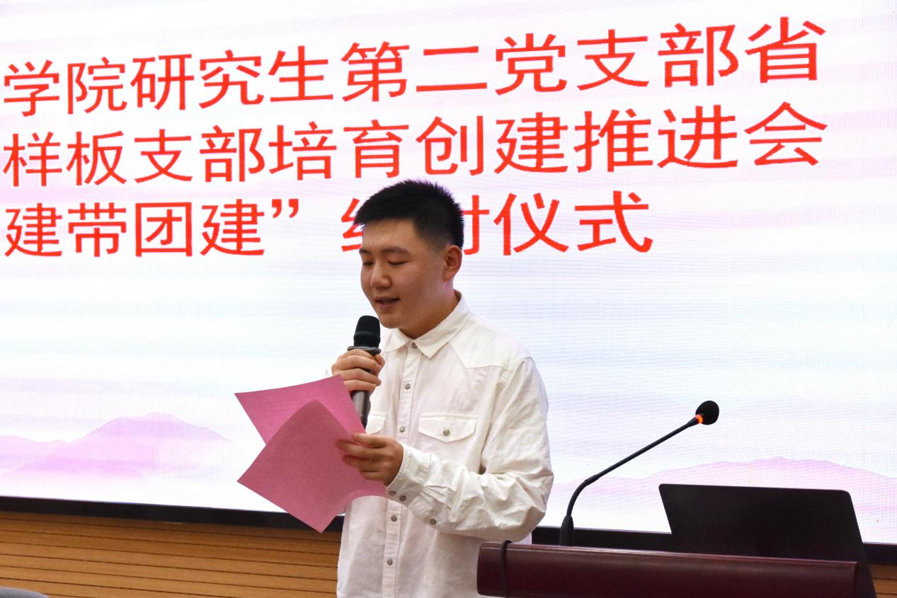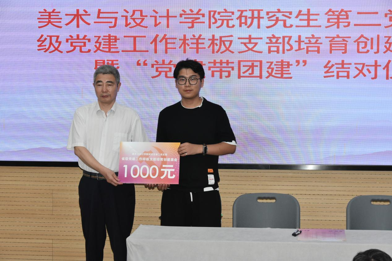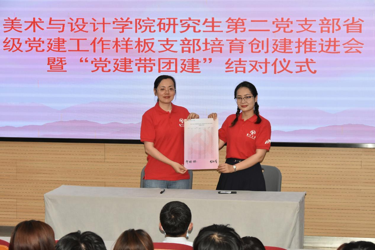 党支部副书记曹敏娟老师和班主任郝琳琳老师代表两个支部在结对名单上签字,正式确定了结对党员与团员名单。党委书记马雷同志代表学院党委为研究生第二党支部颁发了省级党建工作样板支部培育创建基金。党委副书记周锋同志为“党团共建”工作提出了七点要求,并表达了对“党建带团建”工作的美好愿景和殷切希望并宣布了研究生第二党支部“艺心向党”主题创作汇报展的正式开幕。