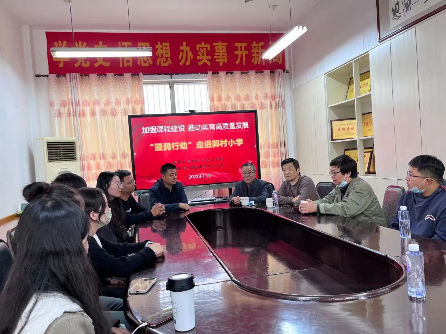 为推动高校落实《教育部高等教育司2022年工作要点》中提到的“把学科专业、课程、教材、教师等人才培养关键环节和要素的质量提升作为主要内涵,从学科专业等宏观层面,到教学组织等中观层面,再到课程、教材等微观层面,全面提高高等教育人才培养质量”。围绕扬州大学本科教学节主题,美术与设计学院坚持内涵发展,提升教师教育教学水平。2022年11月9日,我院美术系贺万里、吴越滨、顾浩三位教授带队赴江都区塘头小学、郭村中心小学开展江苏省“体育美育浸润行动计划”推进活动,以“加强课程建设 推动美育高质量发展”为主旨,强化基层教学组织的功能,激发基层教学组织活力。
