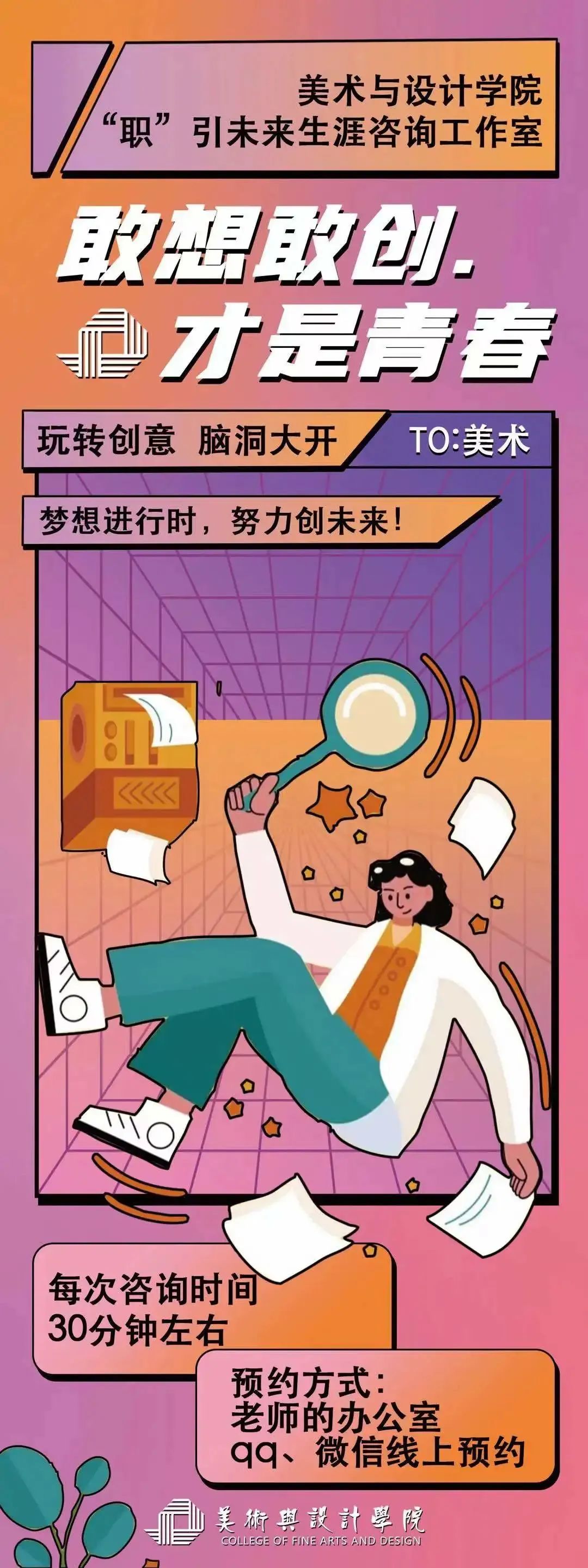 亲爱的同学,新学期已经开始,对待大学四年的生活,是否感到迷茫,对待未来,是否感到彷徨,就业、考研哪条路才是适合自己的?我能做什么?未来该何去何从?假如你也有上面的这些困惑,请不要犹豫,美术与设计学院“职”引未来生涯咨询工作室开始啦!面对不同年级、不同专业的同学积极开展个人、团体职业生涯咨询、就业指导咨询,针对于学生的自我管理、自我认识、自我探索、职业探索、简历制作、求职技巧、求职心理、领域就业等方面给予学生专业的帮助和分析。