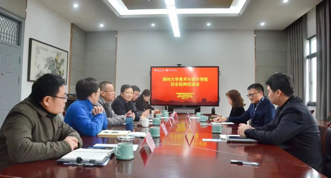 为了推动校企深入合作,持续协同培养优秀设计专业人才,扬州大学美术与设计学院于2023年2月17日举办了“访企拓岗促进会”,本次会议邀请到金螳螂建筑装饰股份有限公司(后文简称金螳螂公司)副总裁兼人力资源中心总监方文祥、人力资源中心副总监高鹏、人力资源经理王勤、扬州大学就业指导中心主任陈轶群,同时,我院参与本次会议的领导老师有院党委书记李向阳、院长李玫、党委副书记周锋、副院长刘智勇、环境设计专业主任张祎、综合办公室主任曹敏娟、院团委(学工办)主任杨千里、辅导员郝琳琳。会议由院党委书记李向阳主持。