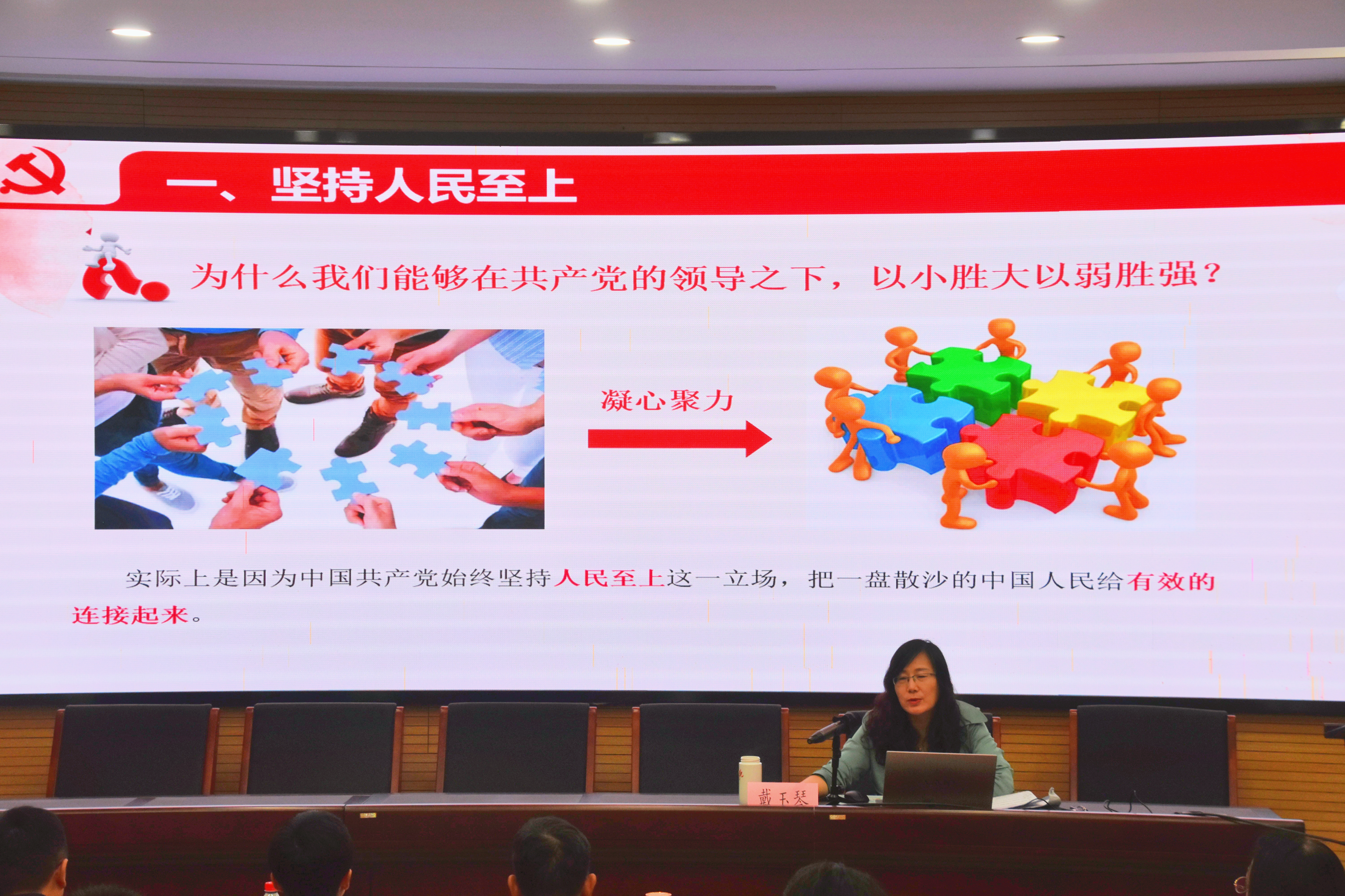 戴玉琴以“习近平新时代中国特色社会主义思想的世界观和方法论”为主题,从坚持人民至上、坚持自信自立、坚持守正创新等六个方面,对世界观和方法论的内涵及重要性做了详实的阐述。戴教授指出,习近平新时代中国特色社会主义思想是内涵丰富、系统完备、逻辑严密的思想体系,蕴含着鲜明的立场观点方法。开展学习贯彻习近平新时代中国特色社会主义思想主题教育就是要全面学习领会习近平新时代中国特色社会主义思想,全面系统掌握这一思想的基本观点、科学体系,把握好这一思想的世界观、方法论,坚持好、运用好贯穿其中的立场观点方法,坚持学思用贯通、知信行统一,把习近平新时代中国特色社会主义思想转化为坚定理想、锤炼党性和指导实践、推动工作的强大力量,努力在以学铸魂、以学增智、以学正风、以学促干方面取得实实在在的成效。