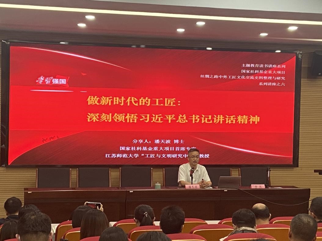 潘天波以“做时代的工匠”为主题,从“如何切磋:工匠精神品格、新时代发展:需要大国工匠、迈向新征程:弘扬工匠精神”三个方面进行了讲解。他提出,弘扬劳模精神强调用劳模的先进思想、模范行动影响和带动全社会;弘扬劳动精神强调正确认识劳动是人类的本质活动;弘扬工匠精神强调在追求卓越中超越自己,从而揭示了三个精神的内在联系。他强调,弘扬工匠精神是时代的命题,具有深厚的理论基础、历史底蕴和实践意义,要充分利用好工匠精神丰富的马克思主义理论基础,不断深化我们对劳动、劳动价值的认识。