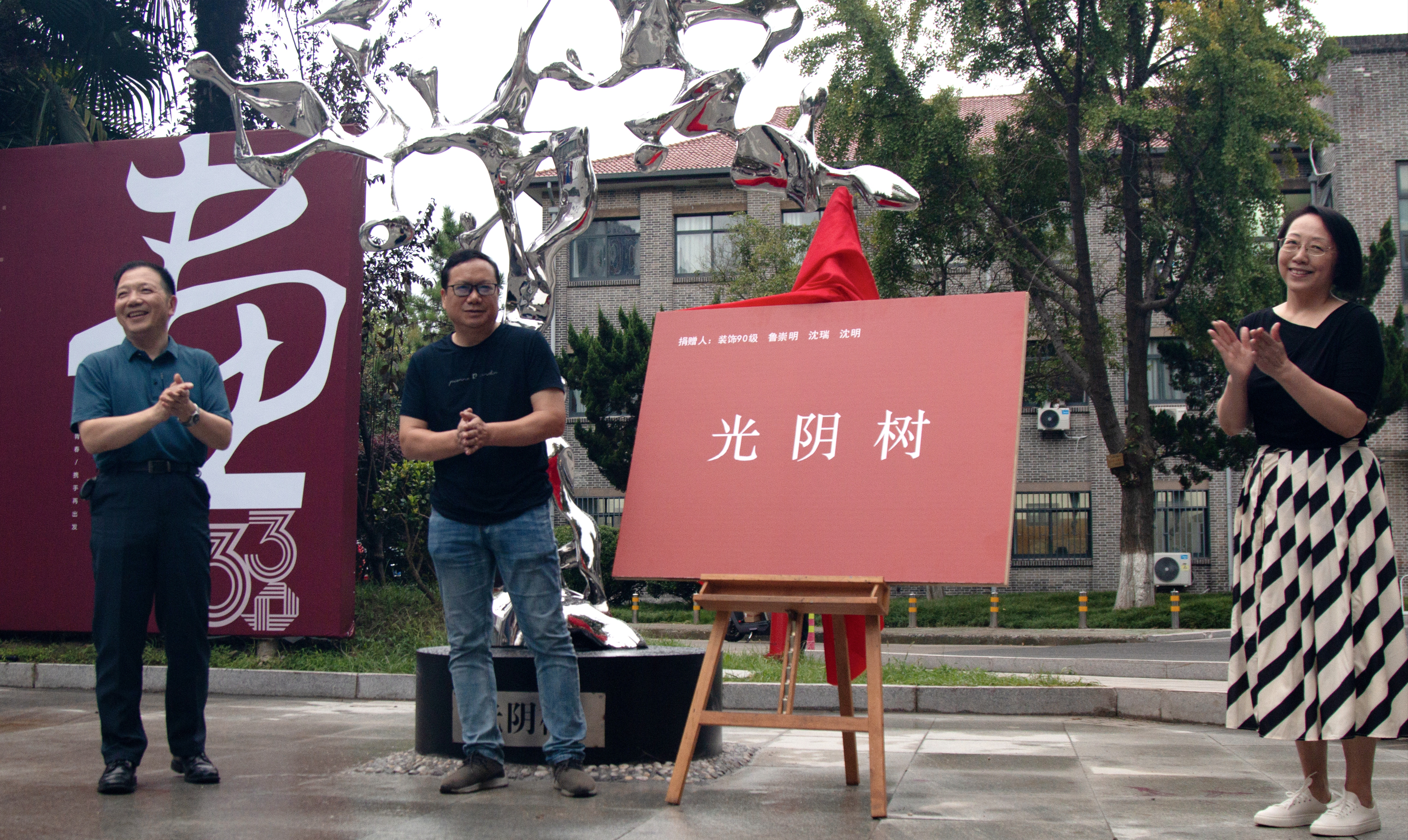 2023年8月,93届校友鲁崇明、沈明、沈瑞代表全班同学捐赠雕塑“光阴树”