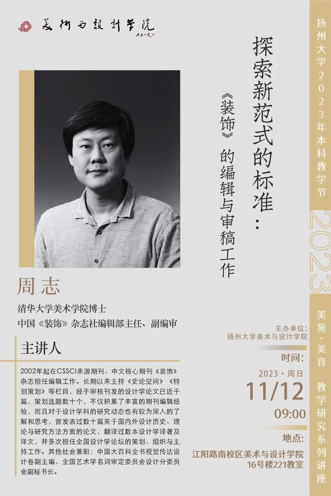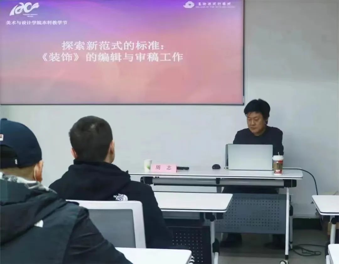 2023年11月12日上午,我院邀请清华大学美术学院博士、中国《装饰》杂志社编辑部主任、副编审周志老师作题为“探索新范式的标准:《装饰》的编辑与审稿工作”的专题讲座”。本次专题讲座,副院长谢玮老师担任学术主持,全院青年教师和部分学生参加讲座。