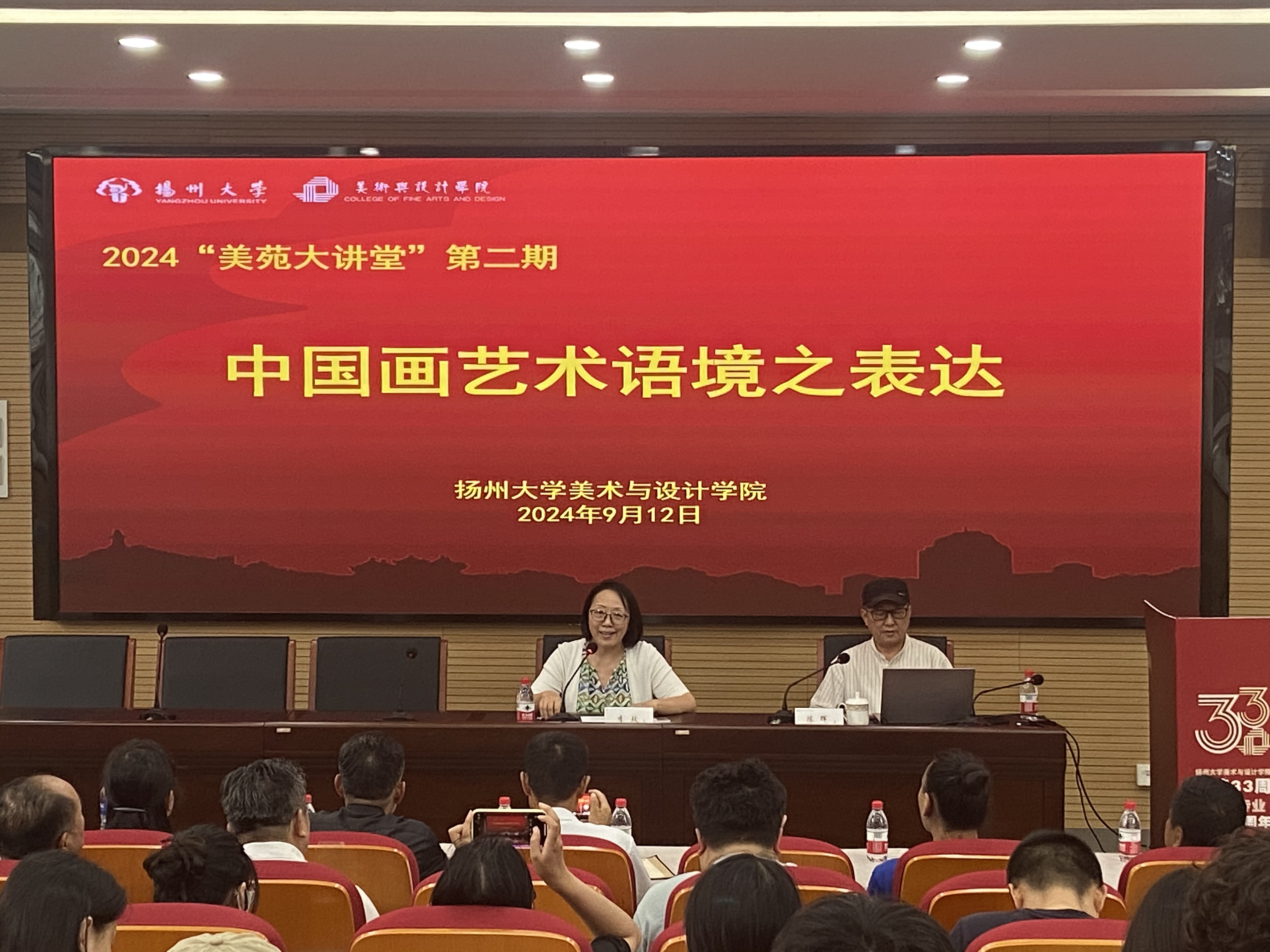 2024年9月12日,陈辉教授在扬大美院报告厅为全体美院师生讲授了《中国画艺术语境之表达》的专业讲座。陈辉教授讲座以中国画历史发展脉络为主线,重点分析了美术史上的经典作品的再认识,从作品的“本土性”(民族性与胸怀祖国)、“时代性”(开放性与放眼世界)、“艺术性”(格调品位与阅历修养)、“个性”(原创性与特色创新)、“技术性”(艺术表现的支撑与手段)五个方面进行讲述,并结合中国画艺术理论对经典作品案例进行独到的解析,此外陈辉老师还介绍展示了此次巡回展览中的个人绘画作品。讲座后,在场师生与陈辉老师又进行了专业性的互动交流。
