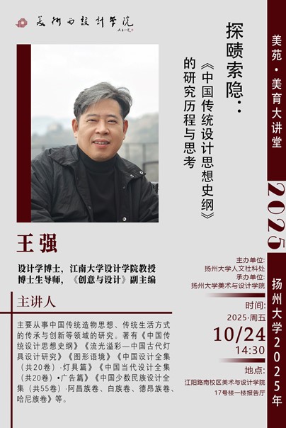 10月24日下午,江南大学王强教授受邀在美术与设计学院报告厅开展专题报告,以《探赜索隐 —— 中国传统设计思想史纲》为题,深入解读中国传统设计思想的深厚底蕴,并结合自身申报国家社科基金重点项目的宝贵经历,为在场师生详细拆解国家项目申报的关键要点与实战技巧,搭建起学院教师有效申报国家级项目的 “桥梁”。本次讲座由学院党委副书记郭兆云老师主持。