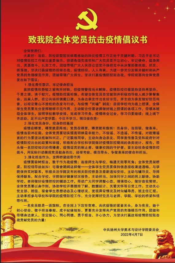 虽然疫情形势较之前有所好转,但疫情警报尚未解除,疫情防控仍需坚持坚持再坚持。千里之堤,溃于蚁穴,疫情防控莫松懈。希望全体党员自觉做到并积极劝导他人减少聚餐集会,远离人群,在公共场所佩戴口罩,为身边亲友作出良好示范,并主动为亲友做好防范科普,以咬定青山不放松的态度与行动,与疫情“死磕”到底!学习是学生的本职,目前学校均为线上授课,全体学生党员要充分发挥榜样示范作用,主动配合任课老师做好线上授课的各项工作,带领本班级全体学生,按照学校教学安排,完成学习任务。疫情终会过去,学习仍要继续;线上线下齐启动,足不出户变学霸;今日不学习,明日徒伤悲!