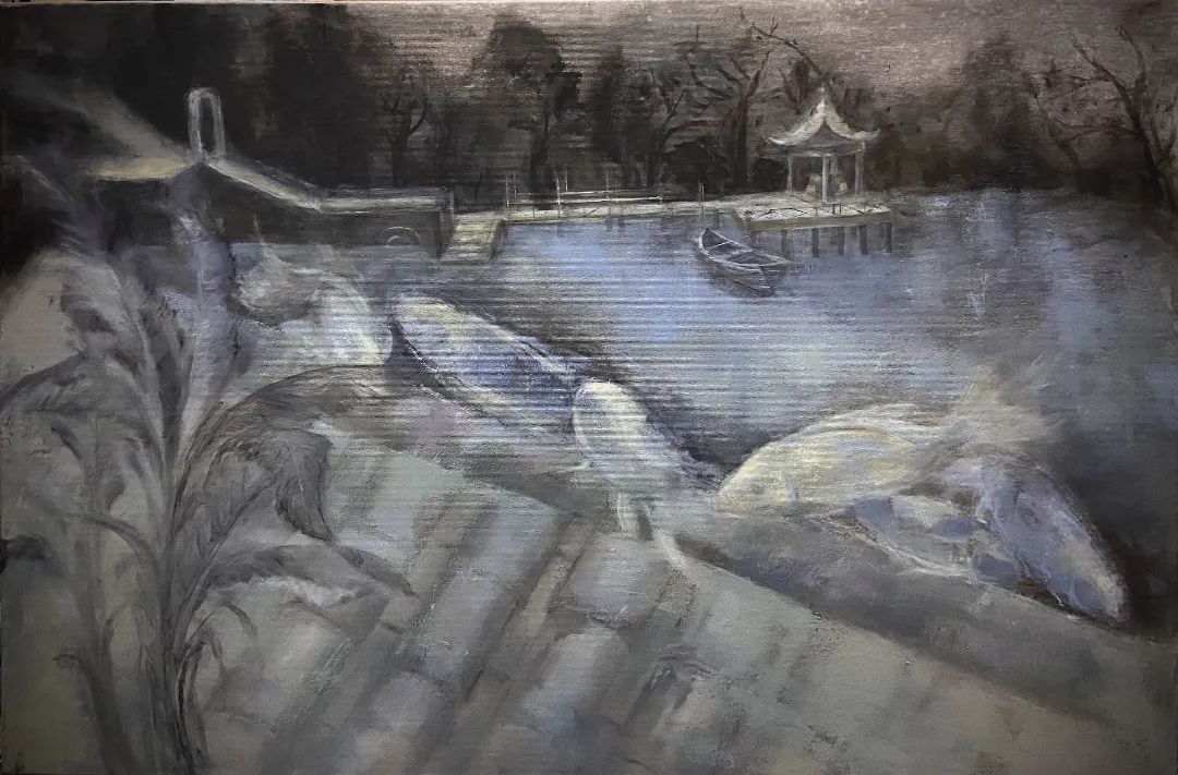 作品展现具有东方情调的黑白灰色彩的创作构想,突破一些超现实主义表现形式上,以往较为僵硬、呆板的画面表达,形成超现实主义具有中国水墨意味的绘画艺术语言的表现形式。在笔触与肌理中,主要学习名家作品中富有变化的油画笔触与肌理,并且中国意象绘画中都比较强调虚实关系,在作画时要避免面面俱到。画面使用灰色调,只有游荡在建筑上方的鱼群与湖心水面使用了淡淡的蓝色,既呼应了超现实主义画派中多使用灰色调的色彩习惯,也是展现了中国传统水墨单色调的意趣。