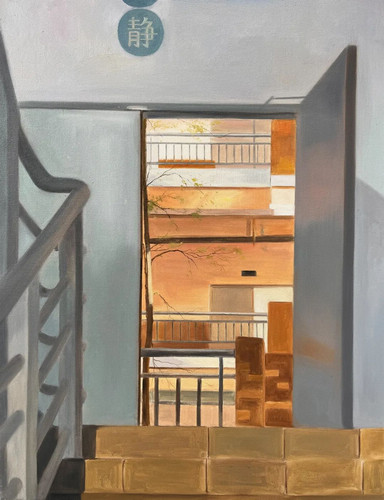 在日常生活中,我总是留意着身边不同的窗景,作品《时光里》系列二记录的是学校教学楼的傍晚,通过不同的观察视角,将点线面组成简练的造型,组合运用到空间中线条的曲直疏密,营造出不同的节奏感和视觉效果来表现画面的造型结构,注重画面的形式感,突出刻画夕阳时刻光线笼罩万物的和谐氛围,描绘出自己生活中的小时光。不同的色调给人带来的感觉是不同的,此幅创作以冷暖色调表现,组合起来后形成和谐安静的画面是我想要达到的最终效果。