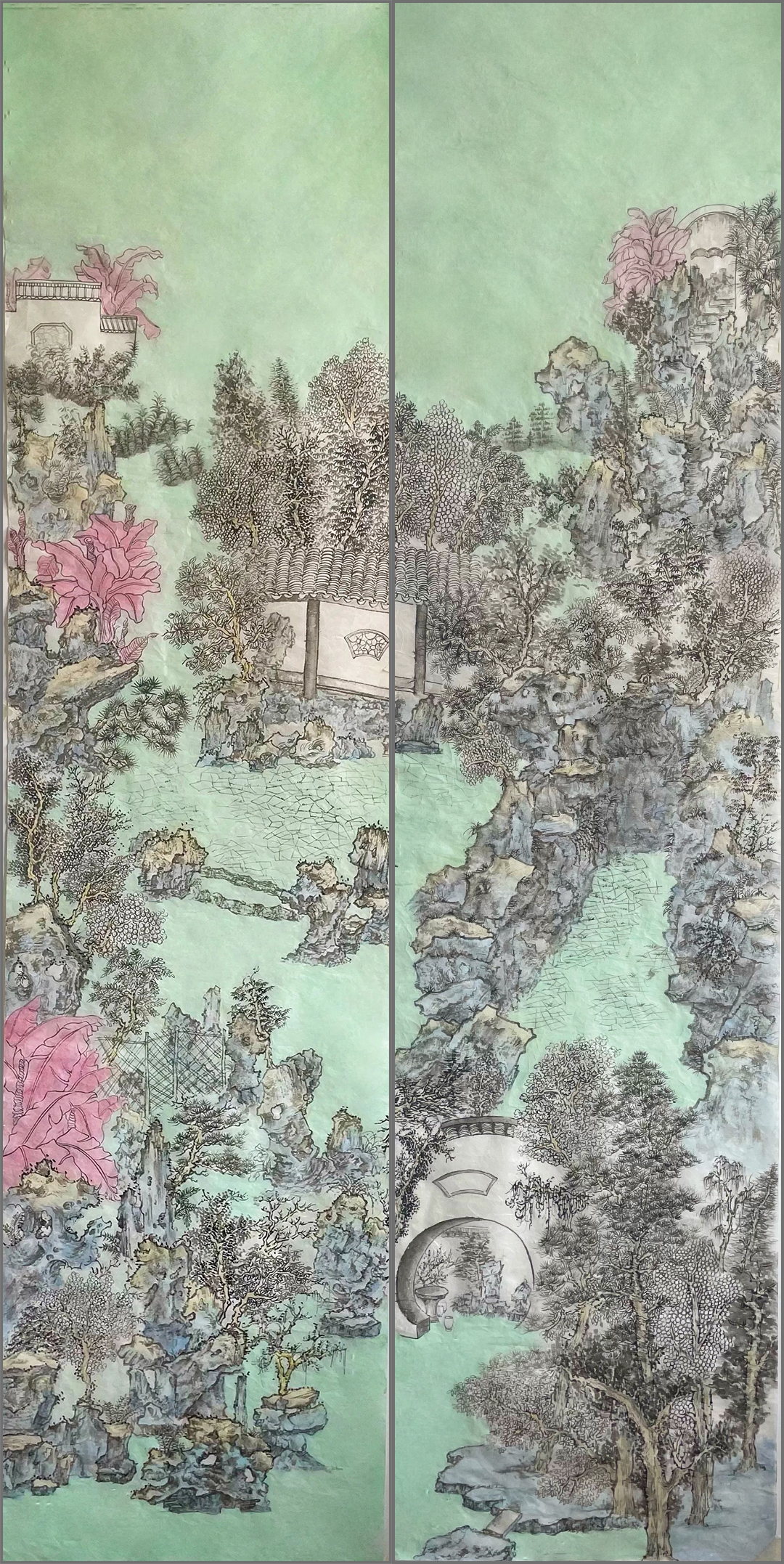 作品多表现江南园林众多的花木种类,采用不规则布局形式,使园林建筑与山、水、石相融合而呈天然之趣。
