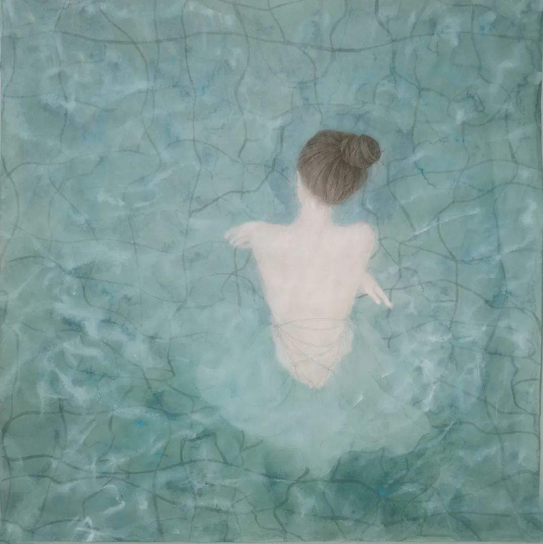 画面底色肌理用撞水撞色技法表现水色淋漓的朦胧氤氲氛围,表现出一个少女蜷缩泳池里,泳池里的砖头在波光粼粼的水中映衬地晃了眼,少女的脊背白皙透亮,纱纱裙在水的浸泡下贴在了少女的胴体上,这波光粼粼的泳池渐渐地扰乱了她的思绪,悄悄地拨打她的心弦,少女的思绪随着水纹的飘荡而飘远。