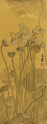 作品以莲蓬为主要描绘对象,表现花落秋实的景致。以疏、密、直、曲的莲蓬头和莲蓬秆增强画面的形式美。