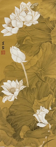 作品通过各种姿态的荷花与荷叶的交织,让画面构图饱满并有律动感。金色的背景加之墨色的晕染,彰显出素雅、古朴的韵味,仿佛那沁人心脾的花香荡漾开来。